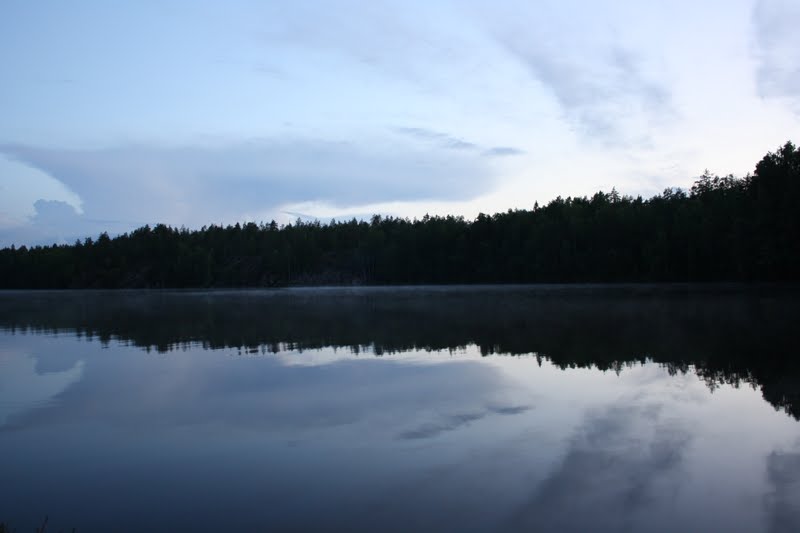 Jälleen kukkaruukusta asiaan, tässä kuvia sieltä grillipaikalta. Oli aika hienon näköstä kun aurinko laski siinä meidän grillaillessa (mäki jopa kääntelin kanafileitä ja makkaroita, jihaa!) ja vähän myöhemmin lammen pinnalle kerääntyi pikku hiljaa enemmän ja enemmän sumua. Lampi muistutti kuulemma vähän Usva-leffan miljöötä (luojan kiitos en oo nähnyt kyseistä leffaa, muutenkin hämyiset metsät kello kymmenen aikaan illalla ei oo ihan mitään lempparijuttuja).